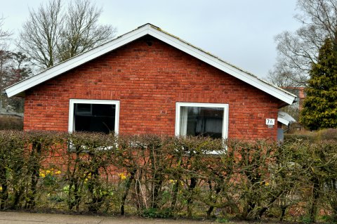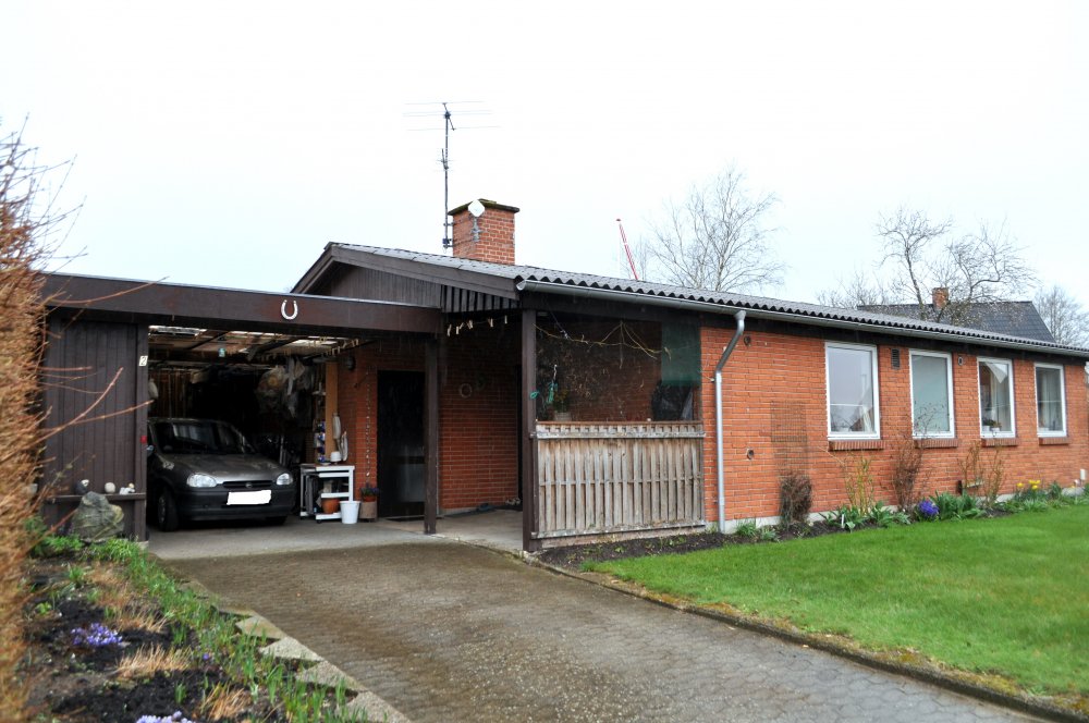 Rødt murstenshus med tre værelser på 81 kvm og tilhørende garage.
